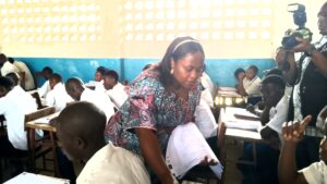 L’inspecteur chef de pool du secondaire de l’EDU-NC Fizi 2 a procédé, en personne, à l’ouverture des mailles contenant les cahiers d’items, et s’en est suivi la distribution de ces derniers dans les salles de classes par la ministre.